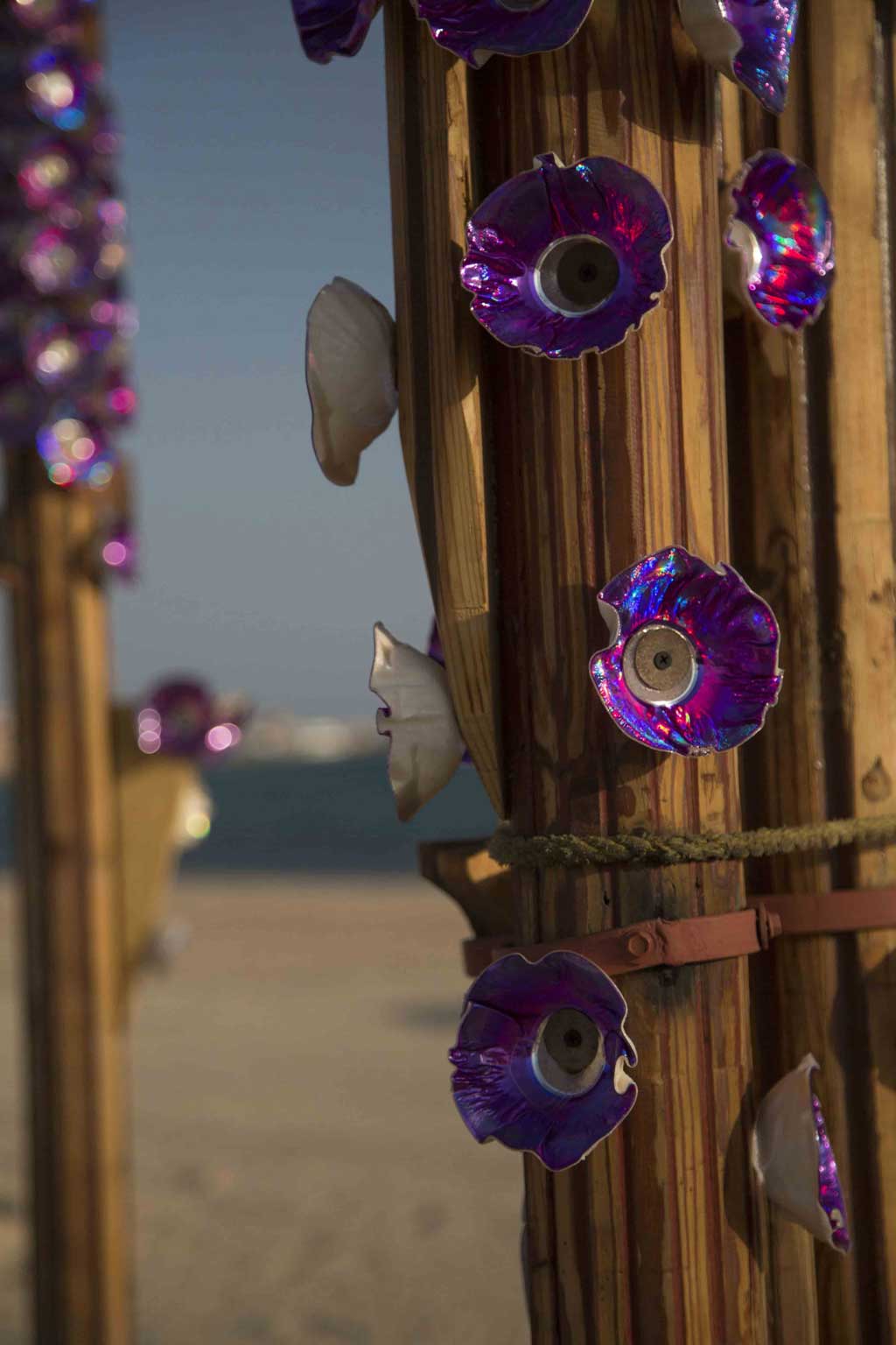 “Tutu” Dancing with Trees, Snake Moult 1 and 2 are organic sculptures, made with recycled materials that invite touch and interaction. They evoke conversation, and the question of desire to allow an exchange with one other, and forge links between all elements in the natural landscape of SOMA Bay.