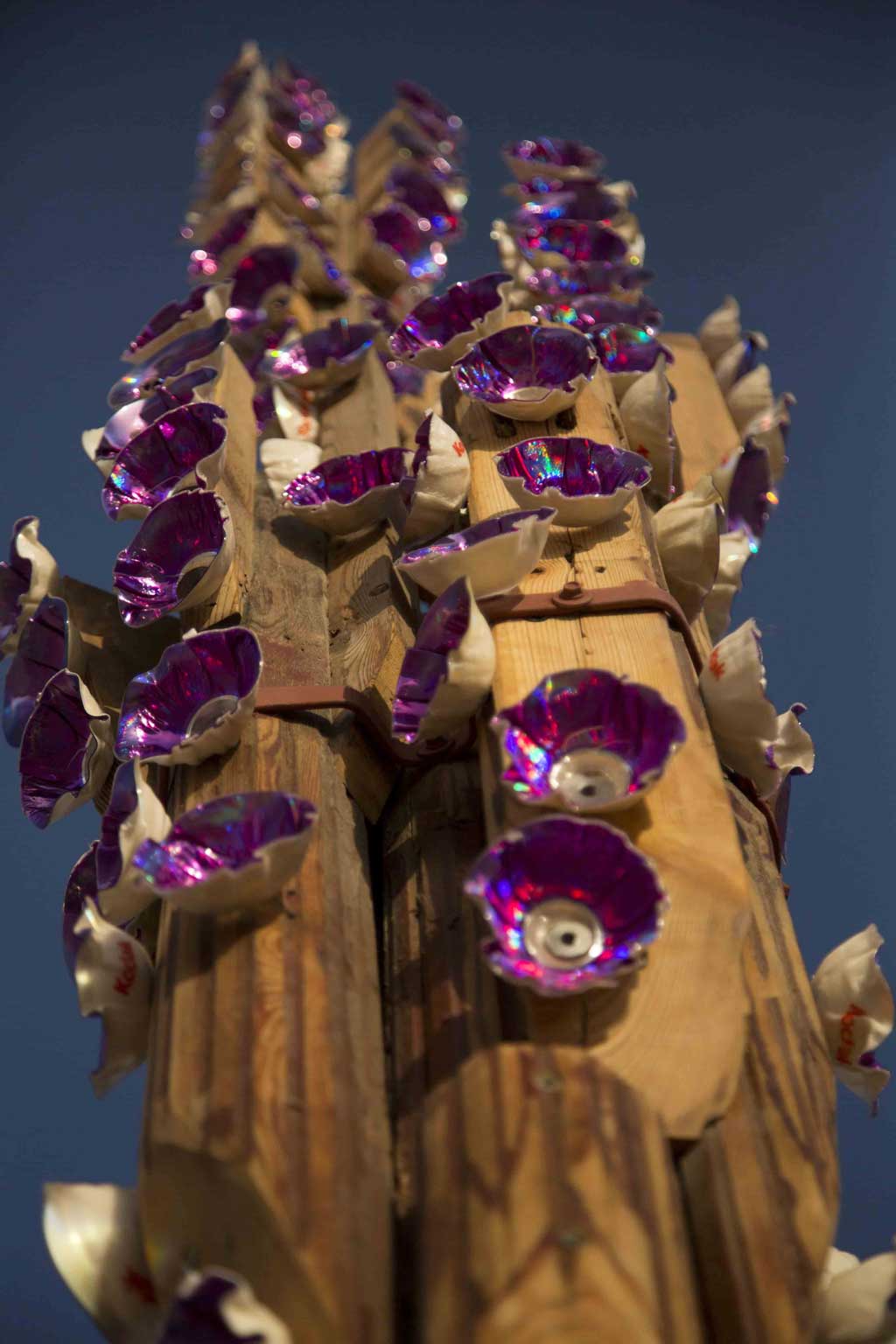 Purple Rain is an artificial garden made out of recycled umbrella poles and DVDs burned and molded into the shape of flowers. However these inert, metal flowers have a different meaning for him: metaphorically they can contain photos, folders but potentially also viruses… they can bring back good and bad memories or remind us a lesson and the path we’ve gone through to find the way again.